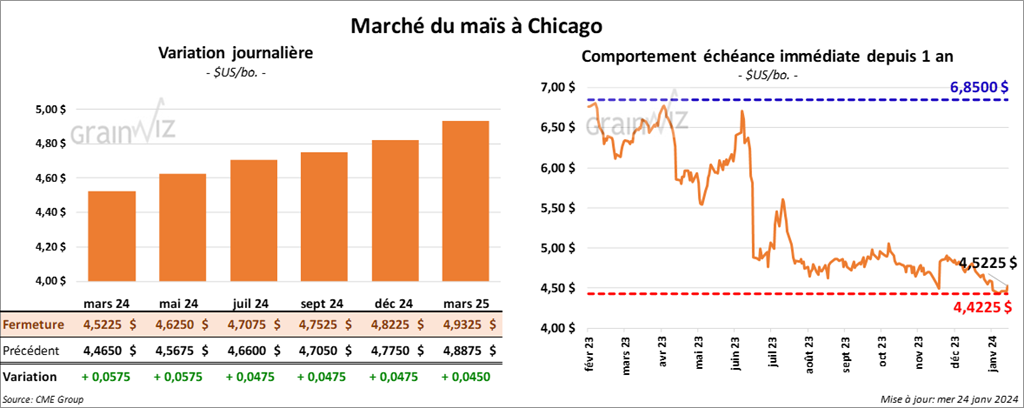 Le contrat de maïs US mars 24 a clôturé à 4,5225 $ (+ 5 ¾ cents). Celui mai 24 a fermé à 4,6250 $ (+ 5 ¾ cents). Celui juil. 24 a terminé à 4,7075 $ (+ 4 ¾ cents).