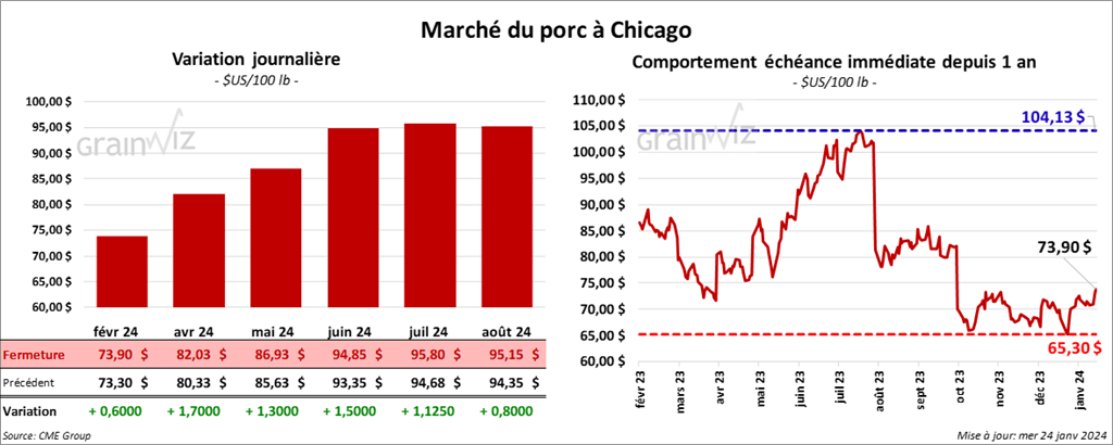 Le contrat de porc US févr. 24 a clôturé à 73,90 $ (+ 60 cents). Celui avr. 24 a fermé à 82,03 $ (+ 1,70 $). Celui mai 24 a terminé à 86,93 $ (+ 1,30 $).