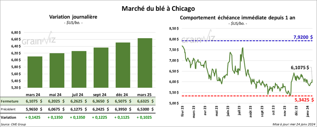 À Chicago, le contrat mars 24 a clôturé à 6,1075 $ (+ 14 ¼ cents). Celui mai 24 a fermé à 6,2025 $ (+ 13 ½ cents). Celui juil. 24 a terminé à 6,2625 $ (+ 13 ½ cents). À Kansas, le contrat de blé dur rouge mars 24 a fini à 6,2560 $ (+ 8 ¼ cents). Celui mai 24 a clôturé à 6,2800 $ (+ 8 ½ cents). Celui juil. 24 a fermé à 6,2920 $ (+ 9 ¼ cents). À Minneapolis, le contrat de blé de printemps mars 24 a terminé à 7,0450 $ (+ 5 ½ cents). Celui mai 24 a fini à 7,0925 $ (+ 5 ¾ cents). Celui juil. 24 a clôturé à 7,1525 $ (+ 5 ¼ cents).