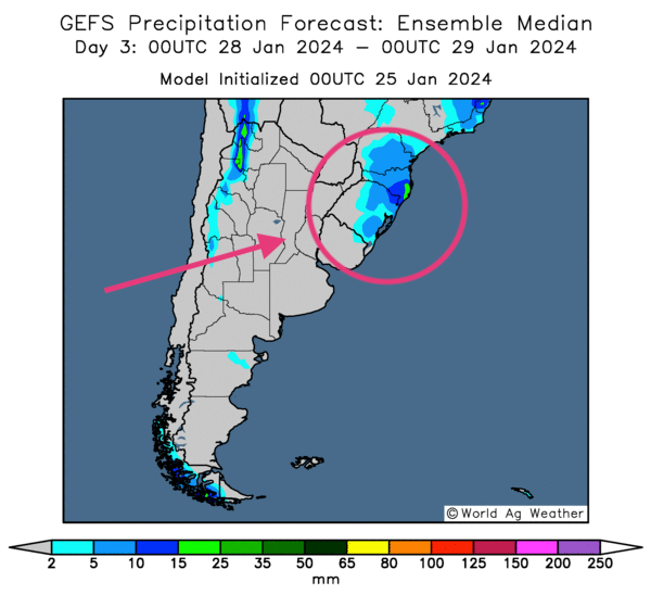 - À court et à moyen termes, World Weather ne prévoit pas de précipitations significatives pour l’ensemble de l’Argentine. L’organisme estime plutôt qu’il faudra probablement attendre le début de février pour en avoir.