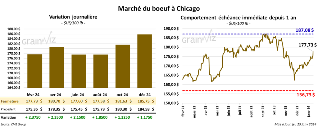 Le contrat de bœuf US févr. 24 a clôturé à 177,73 $ (+ 2,38 $). Celui avr. 24 a fermé à 180,70 $ (+ 2,35 $). Celui juin 24 a terminé à 177,60 $ (+ 2,15 $). Quant au veau US, le contrat mars 24 a fini à 238,18 $ (+ 4,40 $). Celui avr. 24 a clôturé à 243,93 $ (+ 4,13 $). Celui mai 24 a fermé à 249,25 $ (+ 4,15 $).
