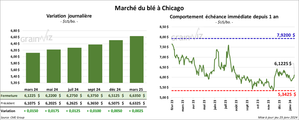 À Chicago, le contrat de blé mars 24 a clôturé à 6,1225 $ (+ 1 ½ cent). Celui mai 24 a fermé à 6,2200 $ (+ 1 ¾ cent). Celui juil. 24 a terminé à 6,2750 $ (+ 1 ¼ cent). À Kansas, le contrat de blé dur rouge mars 24 a fini à 6,3700 $ (+ 11 ¼ cent). Celui mai 24 a clôturé à 6,3600 $ (+ 8 cents). Celui juil. 24 a fermé à 6,3300 $ (+ 3 ¾ cents). À Minneapolis, le contrat de blé de printemps mars 24 a terminé à 7,0900 $ (+ 4 ½ cents). Celui mai 24 a fini à 7,1300 $ (+ 3 ¾ cents). Celui juil. 24 a clôturé à 7,1900 $ (+ 3 ¾ cents).