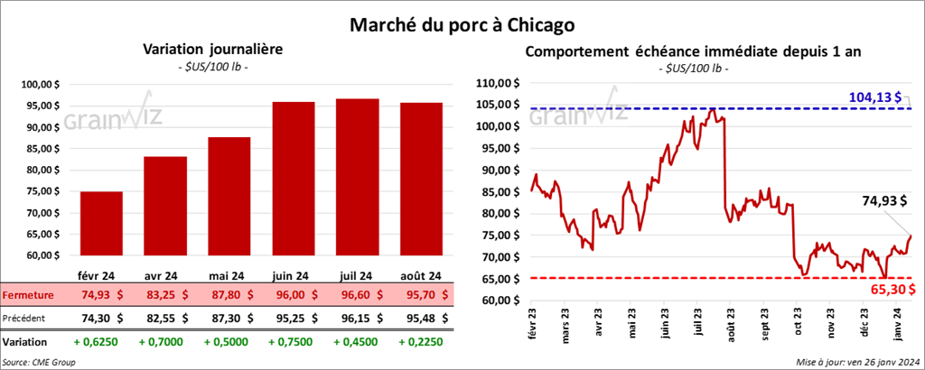 Le contrat de porc US févr. 24 a clôturé à 74,93 $ (+ 63 cents). Celui avr. 24 a fermé à 83,25 $ (+ 70 cents). Celui mai 24 a terminé à 87,80 $ (+ 50 cents).