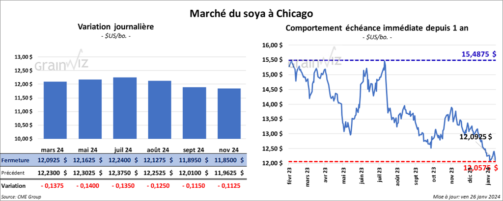 Le contrat de soya US mars 24 a clôturé à 12,0925 $ (- 13 ¾ cents). Celui mai 24 a fermé à 12,1625 $ (- 14 cents). Celui juil. 24 a terminé à 12,2400 $ (- 13 ½ cents). Quant au tourteau de soya US, le contrat mars 24 a fini à 349,00 $/tonne (- 9,20 $/tonne). Celui mai 24 a clôturé à 350,20 $/tonne (- 8,30 $/tonne). Celui juil. 24 a fermé à 354,30 $/tonne (- 7,40 $/tonne). Du côté de l’huile de soya US, le contrat mars 24 a terminé à 46,93 $ (+ 40 points). Celui mai 24 a fini à 47,49 $ (+ 38 points).