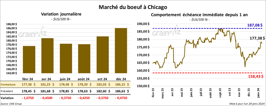 Le contrat de bœuf US févr. 24 a clôturé à 177,38 $ (- 1,08 $). Celui avr. 24 a fermé à 181,23 $ (- 45 cents). Celui juin 24 a terminé à 178,48 $ (- 38 cents). Quant au veau US, le contrat mars 24 a fini à 238,63 $ (- 1,07 $). Celui avr. 24 a clôturé à 244,50 $ (- 1,00 $). Celui mai 24 a fermé à 250,05 $ (- 1,13 $).