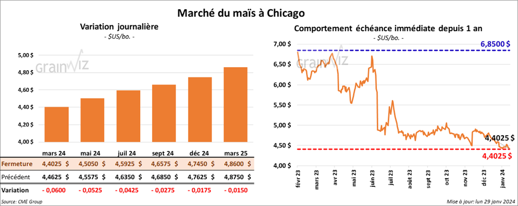 Le contrat de maïs US mars 24 a clôturé à 4,4025 $ (- 6 cents). Celui mai 24 a fermé à 4,5050 $ (- 5 ¼ cents). Celui juil. 24 a terminé à 4,5925 $ (- 4 ¼ cents).
