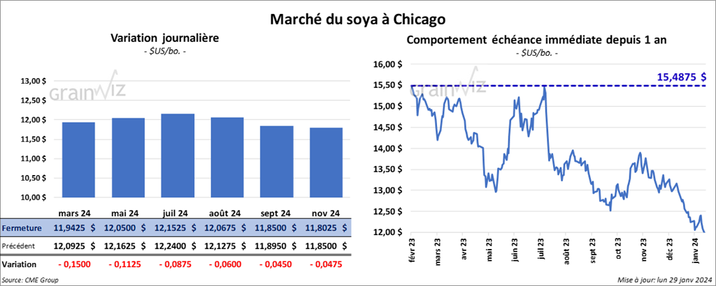 Le contrat de soya US mars 24 a clôturé à 11,9425 $ (- 15 cents). Celui mai 24 a fermé à 12,0500 $ (- 11 ¼ cents). Celui juil. 24 a terminé à 12,1525 $ (- 8 ¾ cents). Quant au tourteau de soya US, le contrat mars 24 a fini à 354,30 $/tonne (+ 5,30 $/tonne). Celui mai 24 a clôturé à 353,00 $/tonne (+ 2,80 $/tonne). Celui juil. 24 a fermé à 356,60 $/tonne (+ 2,30 $/tonne). Du côté de l’huile de soya US, le contrat mars 24 a terminé à 45,55 $ (- 138 points). Celui mai 24 a fini à 46,17 $ (- 132 points).