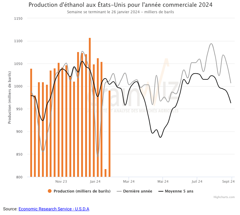Durant la semaine du 26 janvier dernier, la production moyenne d’éthanol US a été 991,000 millions de barils par jour, ce qui était une hausse de 21,1 % comparativement à la semaine précédente et une baisse de 3,6 % par rapport à l’an dernier. Au total, 6,937 millions de barils d’éthanol US ont été produits au cours de la semaine. 96,36 millions de boisseaux de maïs ont été utilisés dans la fabrication de l’éthanol US.
