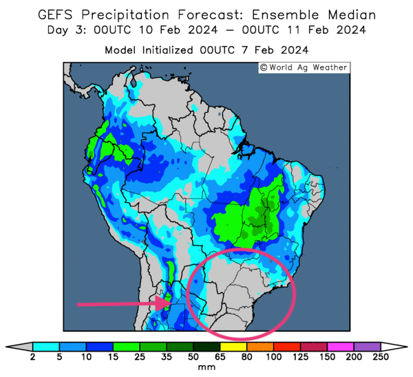 - L’analyse des cartes du Brésil, fournies par World Ag Weather et dessinées jusqu’aux 3 prochains jours, révèle que toutes les régions du Brésil pourraient bénéficier d’une alternance de pluie et d’ensoleillement favorable aux différentes cultures. Le sud-est du Brésil reste toutefois l’exception avec un manque de précipitations significatif probable au cours de cette même période.