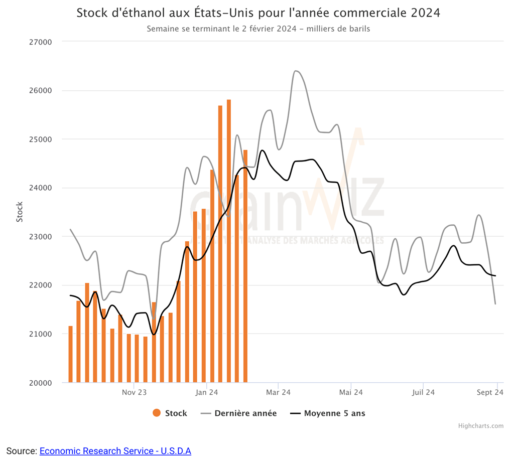 Durant la semaine du 2 février dernier, la production moyenne d’éthanol US a été de 1,033 million de barils par jour, ce qui était une augmentation de 4,2 % comparativement à la semaine précédente et une hausse de 3,3 % par rapport à l’an dernier. Au total, 7,231 millions de barils d’éthanol US ont été produits au cours de la semaine. 102,53 millions de boisseaux de maïs ont été utilisés dans la fabrication de l’éthanol US. Le cumulatif annuel de l’utilisation de maïs pour la production d’éthanol US était de 2,260 milliards de boisseaux.