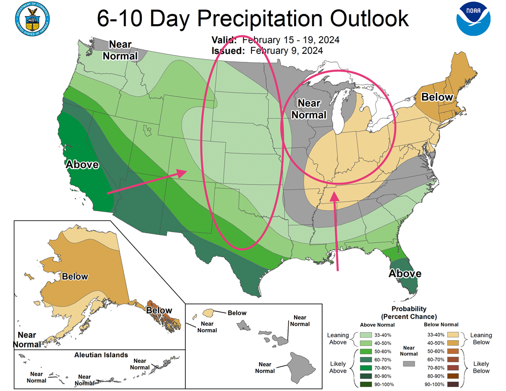 - Cette carte US, fournie par le NOAA et dessinée pour les 6 à 10 prochains jours, indique notamment des probabilités de températures inférieures ou égales à la normale saisonnière pour le Midwest. Elle montre aussi des possibilités de températures proches ou au-delà de la normale saisonnière pour les Plaines US.
