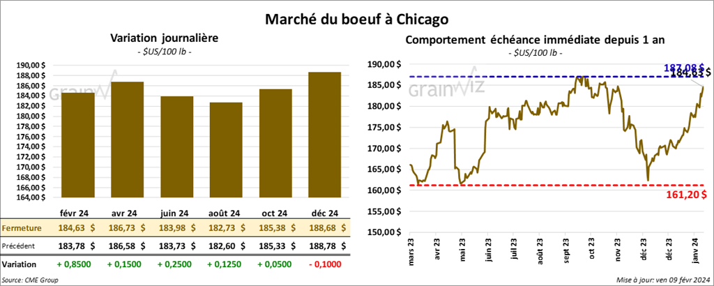 Le contrat de bœuf US févr. 24 a clôturé à 184,63 $ (+ 85 cents). Celui avr. 24 a fermé à 186,73 $ (+ 15 cents). Celui juin 24 a terminé à 183,98 $ (+ 25 cents). Quant au veau US, le contrat mars 24 a fini à 247,15 $ (+ 30 cents). Celui avr. 24 a clôturé à 251,70 $ (- 15 cents). Celui mai 24 a fermé à 255,68 $ (- 63 cents).
