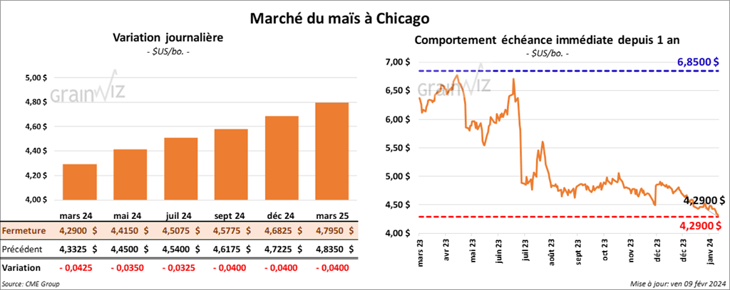 Le contrat de maïs US, mars 24 a clôturé à 4,2900 $ (- 4 ¼ cents). Celui mai 24 a fermé à 4,4150 $ (- 3 ½ cents). Celui juil. 24 a terminé à 4,5075 $ (- 3 ¾ cents).