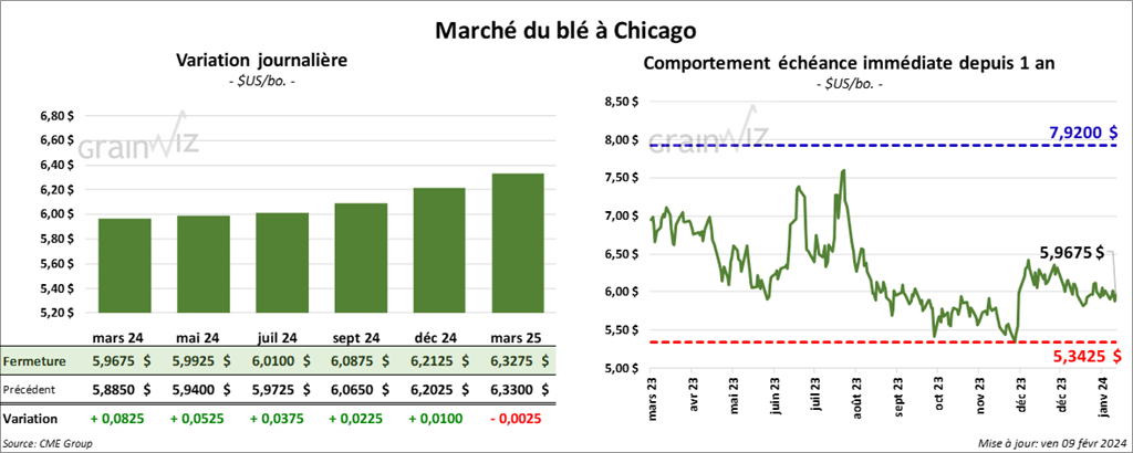 À Chicago, le contrat de blé mars 24 a clôturé à 5,9675 $ (+ 8 ¼ cents). Celui mai 24 a fermé à 5,9925 $ (- 5 ¼ cents). Celui juil. 24 a terminé à 6,0100 $ (+ 3 ¾ cents). À Kansas, le contrat de blé dur rouge mars 24 a fini à 6,0140 $ (+ ½ cent). Celui mai 24 a clôturé à 5,9940 $ (0,0). Celui juil. 24 a fermé à 5,9360 $ (- ¼ cent). À Minneapolis, le contrat de blé de printemps mars 24 a terminé à 6,8425 $ (+ ½ cent). Celui mai 24 a fini à 6,8300 $ (- ¾ cent). Celui juil. 24 a clôturé à 6,8600 $ (- 2 cents).