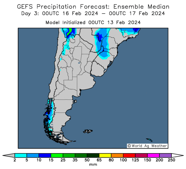 - Cette carte de l’Argentine, fournie par World Ag Weather et dessinée pour les 3 prochains jours, montre notamment un manque de probabilités de précipitations dans toutes les régions (voir les zones grises).