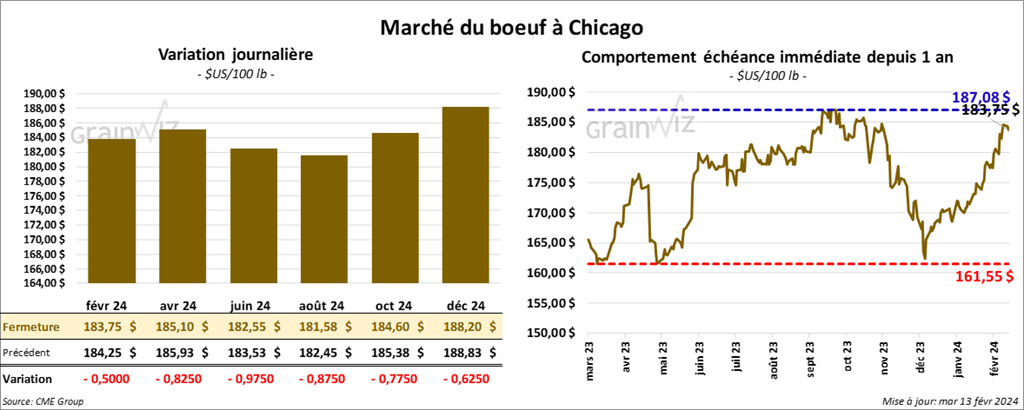 Le contrat de bœuf US févr. 24 a clôturé à 183,75 $ (- 50 cents). Celui avr. 24 a fermé à 185,10 $ (- 83 cents). Celui juin 24 a terminé à 182,55 $ (- 98 cents). Quant au veau US, le contrat mars 24 a fini à 248,00 $ (- 82 cents). Celui avr. 24 a clôturé à 251,75 $ (- 1,43 $). Celui mai 24 a fermé à 255,45 $ (- 1,40 $).