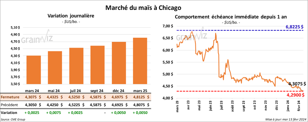 Le contrat de maïs US mars 24 a clôturé à 4,3075 $ (+ ¼ cent). Celui mai 24 a fermé à 4,4325 $ (+ ¾ cent). Celui juil. 24 a terminé à 4,5250 $ (+ ¼ cent).