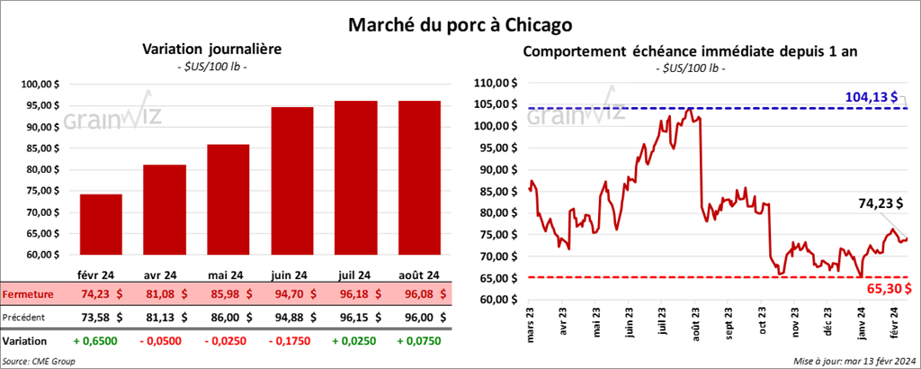 Le contrat de porc US févr. 24 a clôturé à 74,23 $ (+ 65 cents). Celui avr. 24 a fermé à 81,08 $ (- 5 cents). Celui mai 24 a terminé à 85,98 $ (- 2 ½ cents).