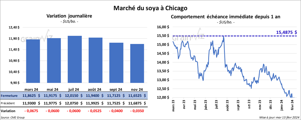 Le contrat de soya US mars 24 a clôturé à 11,8625 $ (- 6 ¾ cents). Celui mai 24 a fermé à 11,9175 $ (- 6 cents). Celui juil. 24 a terminé à 12,0150 $ (- 6 cents). Quant au tourteau de soya US, le contrat mars 24 a fini à 344,80 $/tonne (- 4,10 $/tonne). Celui mai 24 a clôturé à 339,10 $/tonne (- 3,80 $/tonne). Celui juil. 24 a fermé à 342,60 $/tonne (- 3,80 $/tonne). Du côté de l’huile de soya US, le contrat mars 24 a terminé à 47,30 $ (+ 40 points). Celui mai 24 a fini à 47,79 $ (+ 39 points).