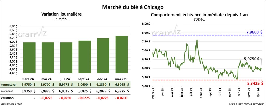 À Chicago, le contrat de blé mars 24 a clôturé à 5,9750 $ (0,0). Celui mai 24 a fermé à 5,9700 $ (- 2 ¼ cents). Celui juil. 24 a terminé à 5,9775 $ (- 2 ½ cents). À Kansas, le contrat de blé dur rouge mars 24 a fini à 5,9440 $ (- 4 ¼ cents). Celui mai 24 a clôturé à 5,9220 $ (- 4 ½ cents). Celui juil. 24 a fermé à 5,8560 $ (- 3 ¼ cents). À Minneapolis, le contrat de blé de printemps US mars 24 a terminé à 6,7175 $ (- 10 ¾ cents). Celui mai 24 a fini à 6,7275 $ (- 8 ¼ cents). Celui juil. 24 a clôturé à 6,7800 $ (- 6 ¾ cents).