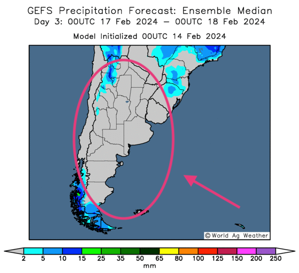- Cette carte de l’Argentine, fournie par World Ag Weather et dessinée pour les 3 prochains jours, indique peu de probabilités de pluies, sauf pour le nord-ouest.