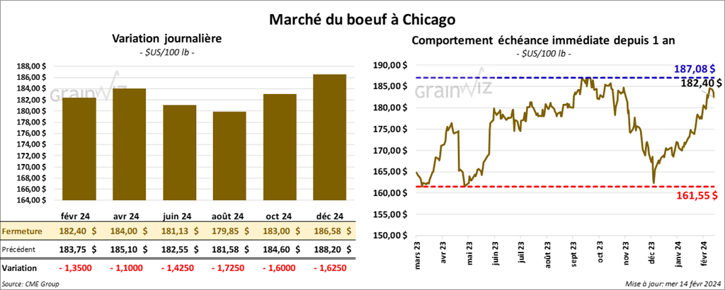 Le contrat de bœuf US févr. 24 a clôturé à 182,40 $ (- 1,35 $). Celui avr. 24 a fermé à 184,00 $ (- 1,10 $). Celui juin 24 a terminé à 181,13 $ (- 1,43 $). Quant au veau US, le contrat mars 24 a fini à 246,22 $ (- 1,77 $). Celui avr. 24 a clôturé à 249,60 $ (- 2,15 $). Celui mai 24 a fermé à 252,95 $ (- 2,50 $).