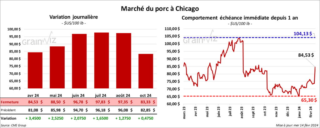 Le contrat de porc US avr. 24 a clôturé à 84,53 $ (+ 3,45 $). Celui mai 24 a fermé à 88,50 $ (+ 2 53 $). Celui juin 24 a terminé à 96,78 $ (+ 2,08 $).