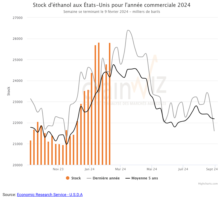 Au cours de la semaine du 9 février dernier, la production moyenne d’éthanol US a été de 1,083 million de barils par jour. Il s’agissait d’un nouveau sommet pour l’année. C’était aussi une hausse de 4,8 % comparativement à la semaine précédente et une augmentation de 6,8 % par rapport à l’an dernier. Au total, 7,581 millions de barils d’éthanol US ont été produits au cours de la semaine. 107,50 millions de boisseaux de maïs US ont été utilisés dans la fabrication de l’éthanol US.