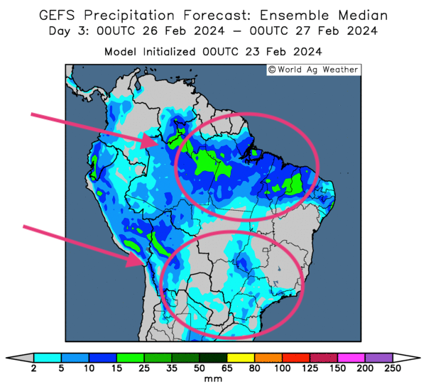 - Pour le Brésil, peu de changements sont anticipés à court et même à plus long termes. Essentiellement, World Weather prévoit donc des précipitations bénéfiques surtout pour le centre du Brésil.