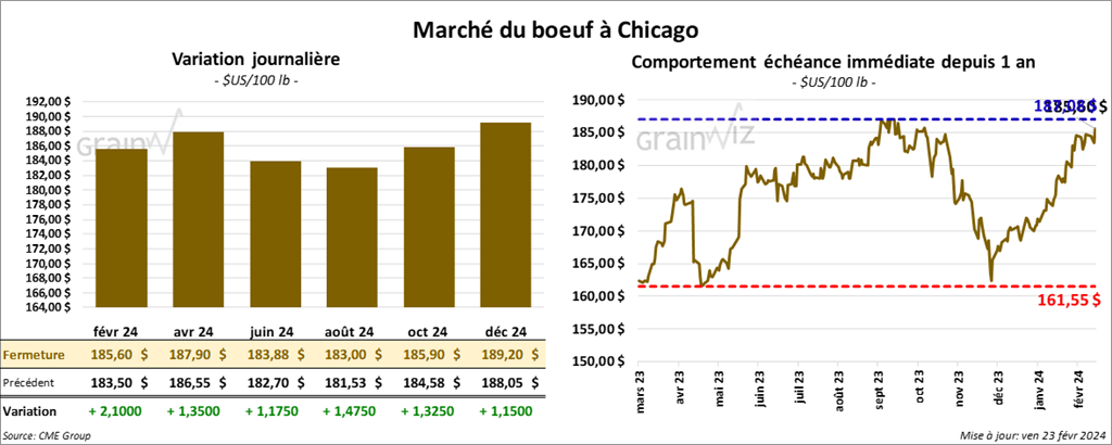 Le contrat de bœuf US févr. 24 a clôturé à 186,60 $ (+ 2,10 $). Celui avr. 24 a fermé à 187,90 $ (+ 1,35 $). Celui juin 24 a terminé à 183,88 $ (+ 1,18 $). Quant veau US, le contrat mars 24 a fini à 254,57 $ (+ 2,52 $). Celui avr. 24 a clôturé à 259,98 $ (+ 3,27 $). Celui mai 24 a fermé à 262,07 $ (+ 2,75 $).