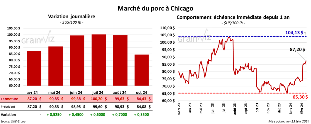 Le contrat de porc US avr. 24 a clôturé à 87,20 $ (0,0). Celui mai 24 a fermé à 90,85 $ (+ 53 cents). Celui juin 24 a terminé à 99,38 $ (+ 45 cents).