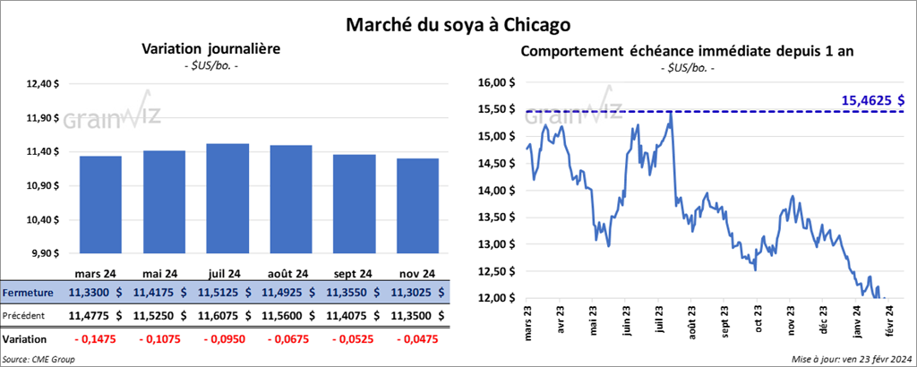 Le contrat de soya US mars 24 a clôturé à 11,3300 $ (- 14 ¾ cents). Celui mai 24 a fermé à 11,4175 $ (- 10 ¾ cents). Celui juil. 24 a terminé à 11,5125 $ (- 9 ½ cents). Quant au tourteau de soya US, le contrat mars 24 a fini à 331,50 $/tonne (- 3,40 $/tonne). Celui mai 24 a clôturé à 328,00 $/tonne (- 3,40 $/tonne). Celui juil. 24 a fermé à 331,50 $/tonne (- 3,30 $/tonne). Du côté de l’huile de soya US, le contrat mars 24 a terminé à 44,02 $ (- 19 points). Celui mai 24 a fini à 44,60 $ (- 20 points).