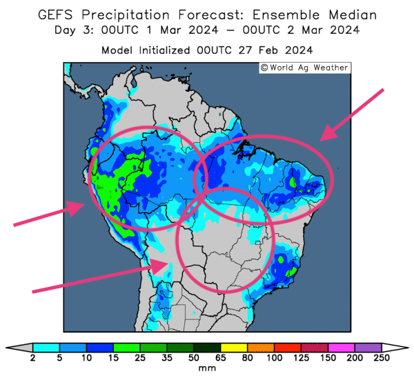 - L’analyse des cartes de l’Argentine, fournies par World Ag Weather et dessinée jusqu’aux 3 prochains jours, montre surtout de bonnes possibilités d’averses pour le Nord et le Centre. Le sud de l’Argentine pourrait, quant à lui, manquer de précipitations.