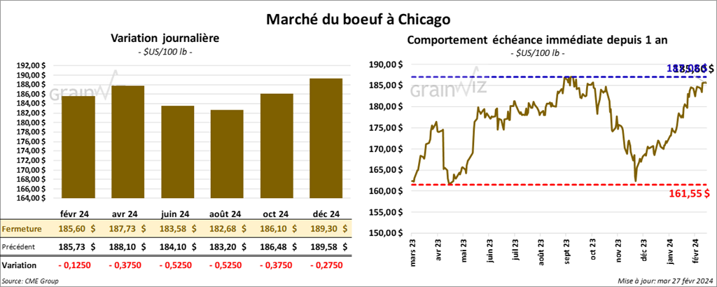 Le contrat de bœuf US févr. 24 a clôturé à 185,60 $ (- 13 cents). Celui avr. 24 a fermé à 187,73 $ (- 38 cents). Celui juin 24 a terminé à 183,58 $ (- 53 cents). Quant au veau US, le contrat mars 24 a fini à 253,00 $ (- 5 cents). Celui avr. 24 a clôturé à 258,95 $ (+ 5 cents). Celui mai 24 a fermé à 261,32 $ (- 25 cents).