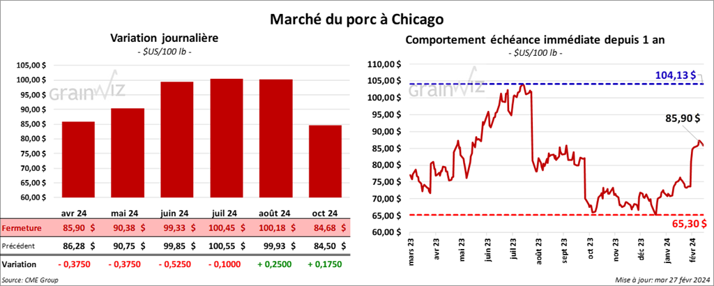 Le contrat de porc US avr. 24 a clôturé à 85,90 $ (- 38 cents). Celui mai 24 a fermé à 90,38 $ (- 38 cents). Celui juin 24 a terminé à 99,33 $ (- 53 cents).
