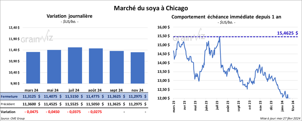 Le contrat de soya US mars 24 a clôturé à 11,3125 $ (- 4 ¾ cents). Celui mais 24 a fermé à 11,4075 $ (- 4 ½ cents). Celui juil. 24 a terminé à 11,5150 $ (- 3 ¾ cents). Quant au tourteau de soya US, le contrat mars 24 a fini à 327,80 $/tonne (- 6,60 $/tonne). Celui mai 24 a clôturé à 324,90 $/tonne (- 3,70 $/tonne). Celui juil. 24 a fermé à 328,30 $/tonne (- 3,10 $/tonne). Du côté de l’huile de soya US, le contrat mars 24 a terminé à 44,91 $ (+ 51 points). Celui mai 24 a fini à 45,53 $ (+ 51 points).