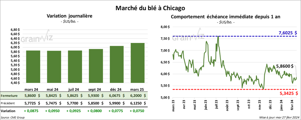 À Chicago, le contrat de blé mars 24 a clôturé à 5,8600 $ (+ 8 ¾ cents). Celui mai 24 a fermé à 5,8425 $ (+ 9 ½ cents). Celui juil. 24 a terminé à 5,8625 $ (+ 9 ¼ cents). À Kansas, le contrat de blé dur rouge mars 24 a fini à 5,9340 $ (+ 9 ¾ cents). Celui mai 24 a clôturé à 5,8560 $ (+ 9 ¼ cents). Celui juil. 24 a fermé à 5,7620 $ (+ 9 ¾ cents). À Minneapolis, le contrat de blé de printemps mars 24 a terminé à 6,5875 $ (+ 10 ½ cents). Celui mai 24 a fini à 6,6225 $ (+ 9 ½ cents). Celui juil. 24 a clôturé à 6,6650 $ (+ 8 ¾ cents).