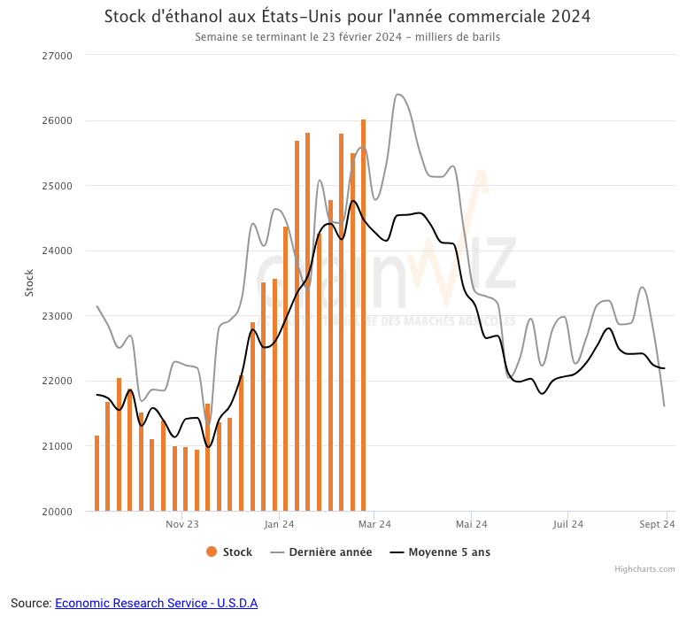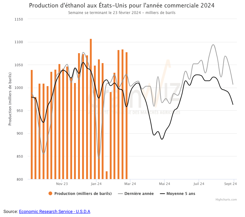 Au cours de la semaine du 23 février dernier, la production moyenne d’éthanol US a été de 1,078 million de barils par jour. Il s’agissait d’une baisse de 0,6 % comparativement à la semaine précédente et d’une hausse de 7,5 % par rapport à l’an passé. Au total, 7,546 millions de barils d’éthanol US ont été produits au cours de la semaine. 107,00 millions de boisseaux de maïs ont été utilisés dans la fabrication de l’éthanol US.