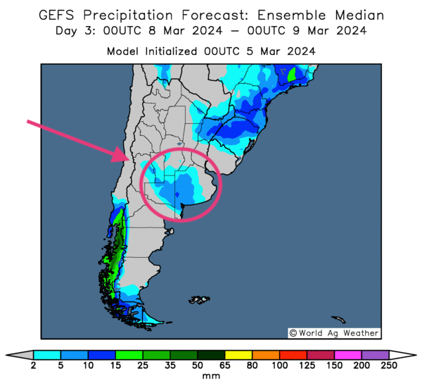 - Cette carte de l’Argentine, fournie par World Ag Weather et dessinée pour les 3 prochains jours, indique notamment des probabilités de précipitations pour le Centre-Est, aux alentours de la province de Buenos Aires.