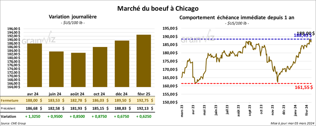 Le contrat de bœuf US avr. 24 a clôturé à 188,00 $ (+ 1,33 $). Celui juin 24 a fermé à 183,53 $ (+ 95 cents). Celui août 24 a terminé à 182,78 $ (+ 85 cents). Quant au veau US, le contrat mars 24 a fini à 252,30 $ (+ 75 cents). Celui avr. 24 a clôturé à 257,18 $ (+ 1,43 $). Celui mai 24 a fermé à 258,70 $ (+ 93 cents).