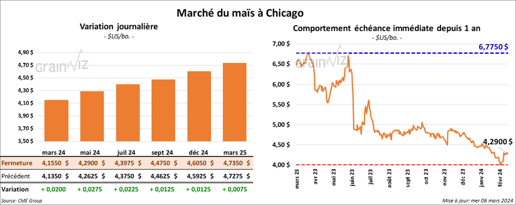 Le contrat de maïs US mars 24 a clôturé à 4,1550 $ (+ 2 cents). Celui mai 24 a fermé à 4,2900 $ (+ 2 ¾ cents). Celui juil. 24 a terminé à 4,3975 $ (+ 2 ¼ cents).