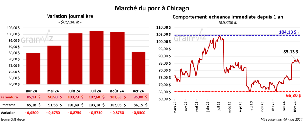 Le contrat de porc US avr. 24 a clôturé à 85,13 $ (- 5 cents). Celui mai 24 a fermé à 90,90 $ (- 68 cents). Celui juin 24 a terminé à 100,73 $ (- 88 cents).