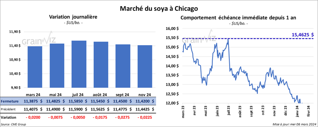 Le contrat de soya US mars 24 a clôturé à 11,3875 $ (- 2 cents). Celui mai 24 a fermé à 11,4825 $ (- ¾ cent). Celui juil. 24 a terminé à 11,5850 $ (- ½ cent). Quant au tourteau de soya US, le contrat mars 24 a fini à 334,50 $/tonne (+ 3,30 $/tonne). Celui mai 24 a clôturé à 330,30 $/tonne (+ 40 cents/tonne). Celui juil. 24 a fermé à 333,20 $/tonne (+ 10 cents/tonne). Du côté de l’huile de soya US, le contrat mars 24 a terminé à 45,00 $ (+ 49 points). Celui mai 24 a fini à 45,30 $ (+ 26 points).