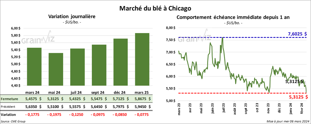 À Chicago, le contrat de blé mars 24 a clôturé à 5,4575 $ (- 17 ¾ cents). Celui mai 24 a fermé à 5,3125 $ (- 19 ¾ cents). Celui juil. 24 a terminé à 5,4325 $ (- 12 ½ cents). À Kansas, le contrat de blé dur rouge a fini à 5,7620 $ (- 15 ¼ cents). Celui mai 24 a clôturé à 5,5620 $ (- 13 cents). Celui juil. 24 a fermé à 5,4620 $ (- 11 ½ cents). À Minneapolis, le contrat de blé de printemps mars 24 a terminé à 6,5750 $ (+ 9 ¼ cents). Celui mai 24 a fini à 6,4725 $ (- 8 ¼ cents). Celui juil. 24 a clôturé à 6,4775 $ (- 9 ¾ cents).
