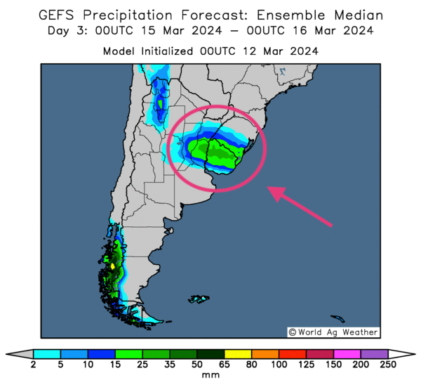 - Cette carte de l’Argentine, fournie par World Ag Weather et dessinée pour les 3 prochains jours, montre notamment des probabilités de pluies abondantes pour la province argentine d’Entre Rios. Ces averses pourraient même toucher l’Uruguay, un pays qui se trouve à l’est d’Entre Rios.
