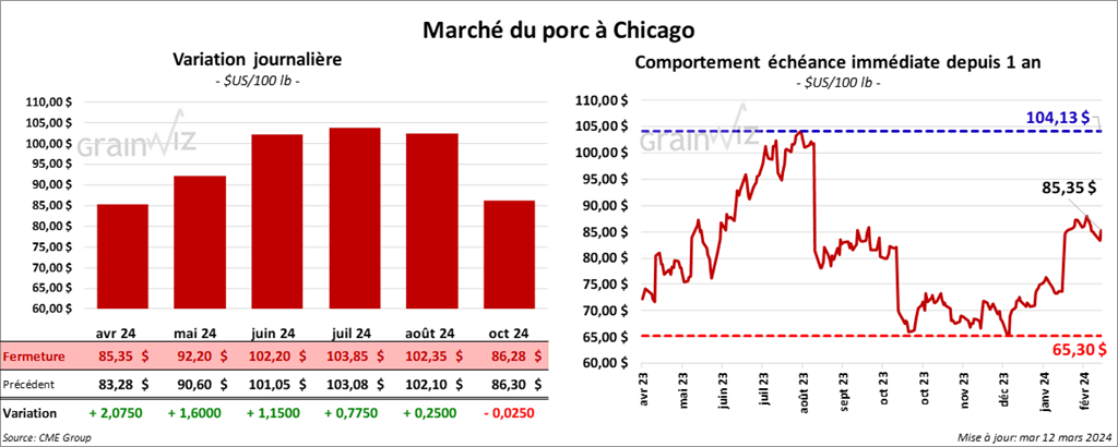 Le contrat de porc US avr. 24 a clôturé à 85,35 $ (+ 2,08 $). Celui mai 24 a fermé à 92,20 $ (+ 1,60 $). Celui juin 24 a terminé à 102,20 $ (+ 1,15 $).