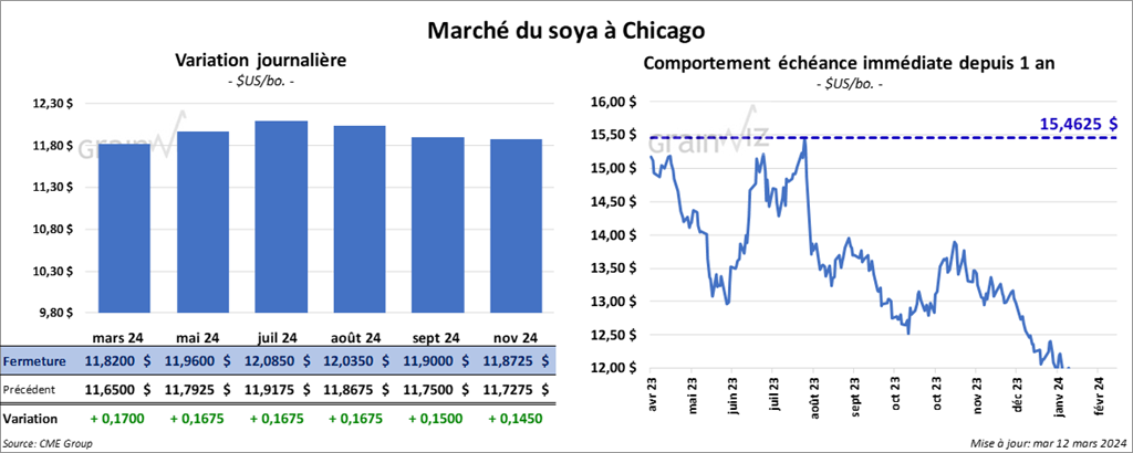 Le contrat de soya US mars 24 a clôturé à 11,8200 $ (+ 17 cents). Celui mai 24 a fermé à 11,9600 $ (+ 16 ¾ cents). Celui juil. 24 a terminé à 12,0850 $ (+ 16 ¾ cents). Quant au tourteau de soya US, le contrat mars 24 a fini à 333,80 $/tonne (- 30 cents/tonne). Celui mai 24 a clôturé à 339,20 $/tonne (+ 2,00 $/tonne). Celui juil. 24 a fermé à 342,90 $/tonne (+ 2,20 $/tonne). Du côté de l’huile de soya US, le contrat mars 24 a terminé à 47,23 $ (+ 118 points). Celui mai 24 a fini à 47,82 $ (+ 118 points).
