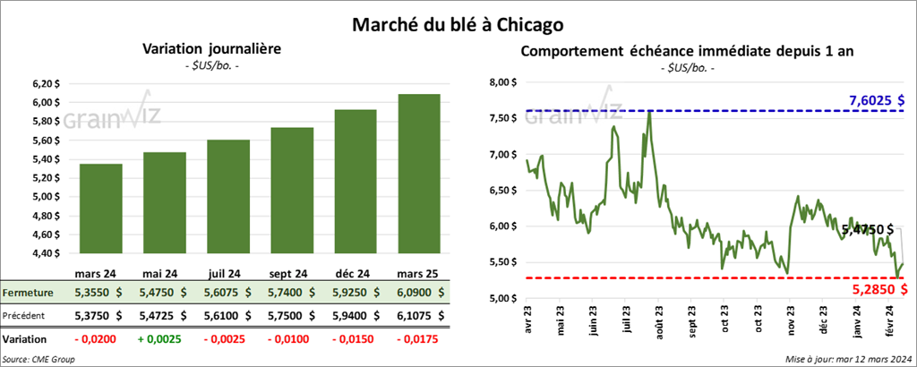 À Chicago, le contrat de blé mars 24 a clôturé à 5,3550 $ (- 2 cents). Celui mai 24 a fermé à 5,4750 $ (+ ¼ cent). Celui juil. 24 a terminé à 5,6075 $ (- ¼ cents). À Kansas, le contrat de blé dur rouge mars 24 a fini à 6,2320 $ (+ 4 ¾ cents). Celui mai 24 a clôturé à 5,9720 $ (- 1 ½ cent). Celui juil. 24 a fermé à 5,8740 $ (- ¼ cent). À Minneapolis, le contrat de blé de printemps mars 24 a terminé à 6,6025 $ (- 6 ¾ cents). Celui mai 24 a fini à 6,7200 $ (+ 2 cents). Celui juil. 24 a clôturé à 6,7550 $ (+ 2 cents).