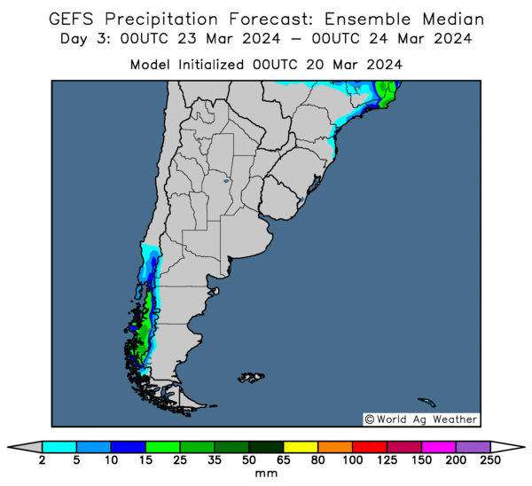 - Pour l’Argentine, l’analyse des cartes fournies par World Ag Weather et dessinées jusqu’aux 3 prochains jours, indique surtout une fin des pluies abondantes prévues initialement pour le Nord argentin. Ces averses qui pourraient se concentrer surtout dans le nord-est, dans les provinces d’Entre Rios et de Santa Fe, pourraient rapidement faire place à des conditions ensoleillées à la grandeur de l’Argentine.