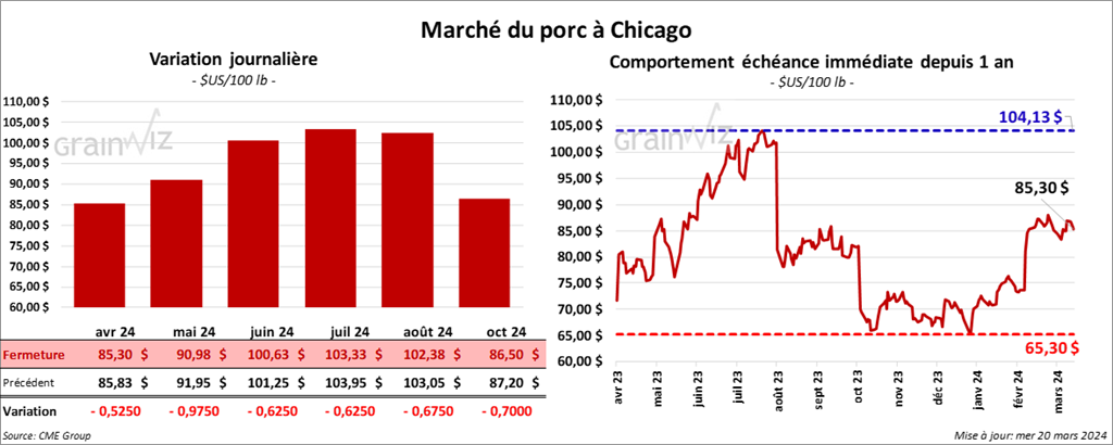 Le contrat de porc US avr. 24 a clôturé à 85,30 $ (- 53 cents). Celui mai 24 a fermé à 90,98 $ (- 98 cents). Celui juin 24 a terminé à 100,63 $ (- 63 cents).
